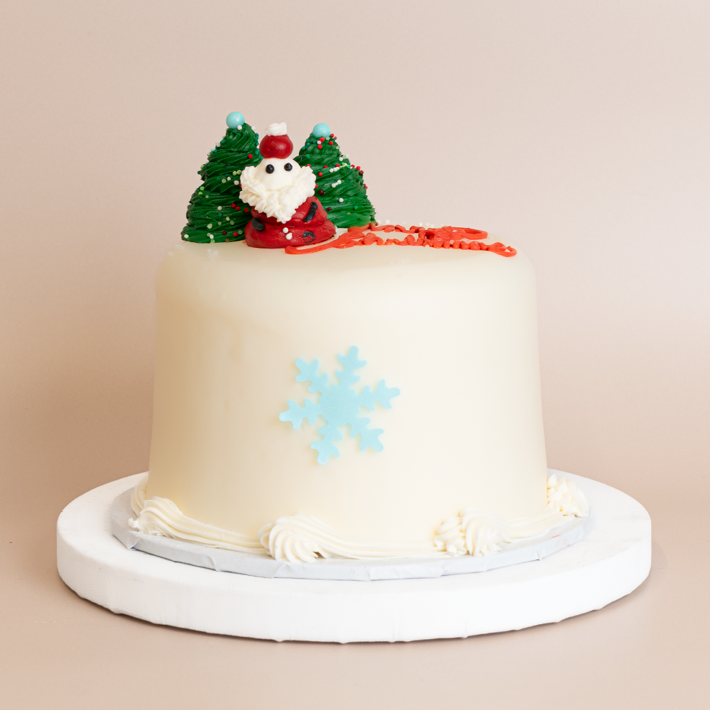 Welcome winter magic to your holiday table with our enchanting Christmas Snowflake Triple Berry Cake. Our signature triple berry filling bursts with fresh strawberries, blueberries, and raspberries between layers of vanilla sponge cake. Adorned with a charming buttercream Santa face, miniature Christmas trees with edible pearls, and an elegant blue snowflake design, this whimsical creation brings festive cheer to any celebration. Perfect as a delightful centerpiece or special holiday gift.