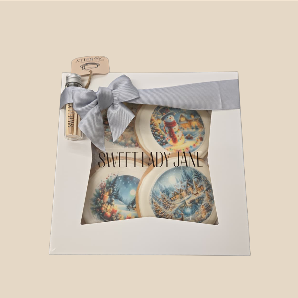 Sweet Lady Jane's exclusive Christmas Cookie Collection arrives in our signature white window box, tied with sophisticated ribbon and finished with our iconic seal. Inside, discover four enchanting edible image sugar cookies—each featuring a different nostalgic holiday scene, printed on our famous buttery cookies and framed with hand-piped vanilla buttercream rosettes. Individually crafted in our Los Angeles bakery using time-honored recipes since 1988, this ready-to-gift collection is the perfect expression of holiday elegance for hosting, gifting, or making any celebration unforgettable. Limited edition for the season; specific designs may vary based on availability.